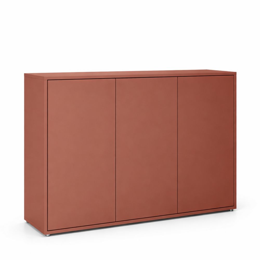 Geräumiger Stauraum: Drei Schranktüren bieten Platz für Kleidung, Deko oder Haushaltsgegenstände. Terrakotta-Farbe: Schafft eine gemütliche und moderne Atmosphäre im Wohnzimmer oder Schlafzimmer. Vielseitig einsetzbar: Geeignet für Wohnzimmer, Schlafzimmer oder Flur – sorgt für Ordnung und zusätzlichen Stauraum. Robust: Aus Holzwerkstoff gefertigt für Stabilität und Langlebigkeit. Kompakte Tiefe: Mit 34,9 cm Tiefe ideal auch für kleinere Räume. Schubladen und Fächer bieten Platz für Kleidung, Unterlagen, Technik oder Deko.