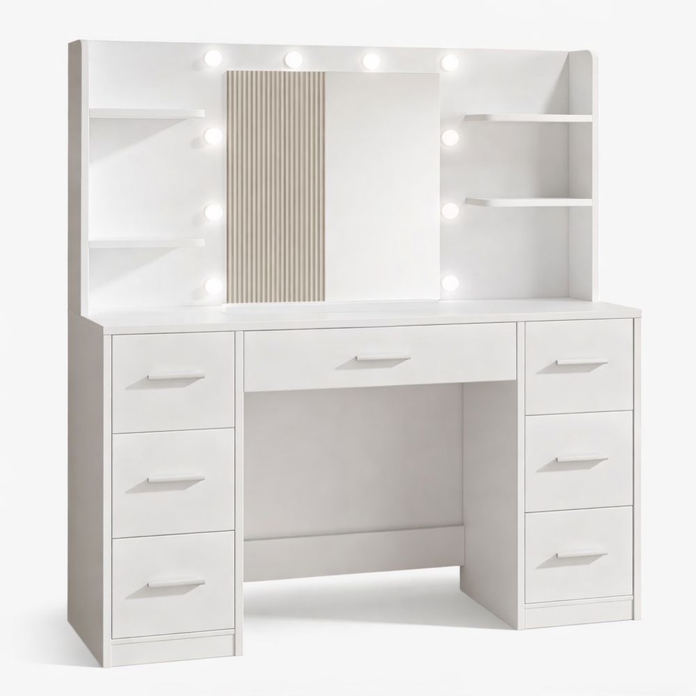 Viel Stauraum: Dieser Schminktisch verfügt über 7 Schubladen auf Metallschienen, 4 offene Ablagefächer und einen praktischen Föhnhalter für Ihre Beauty-Produkte. Zusätzliche Schmuckhaken halten Ihre Accessoires, Ketten und Armbänder organisiert. Verstellbare LED-Leuchten: Der Spiegel ist von dimmbaren LED-Leuchten umgeben. Sie können zwischen 3 Lichtfarben (kaltes, natürliches und warmes Licht) wechseln und die Helligkeit anpassen. Dadurch erhalten Sie die passende Beleuchtung zum Schminken und zur Hautpflege. Ladestation: Mit AC-Steckdosen, einem USB-A-Anschluss und einem USB-C-Anschluss können Sie elektronische Geräte direkt am Tisch laden und betreiben. Material und Details: Hergestellt aus Holzspanplatte, dieser Schminktisch kombiniert Design mit Funktion. Kabellöcher und ein Kippschutz sorgen für Ordnung und Sicherheit. Einfache Montage: Die bebilderte Anleitung und nummerierten Teile ermöglichen einen unkomplizierten Aufbau.