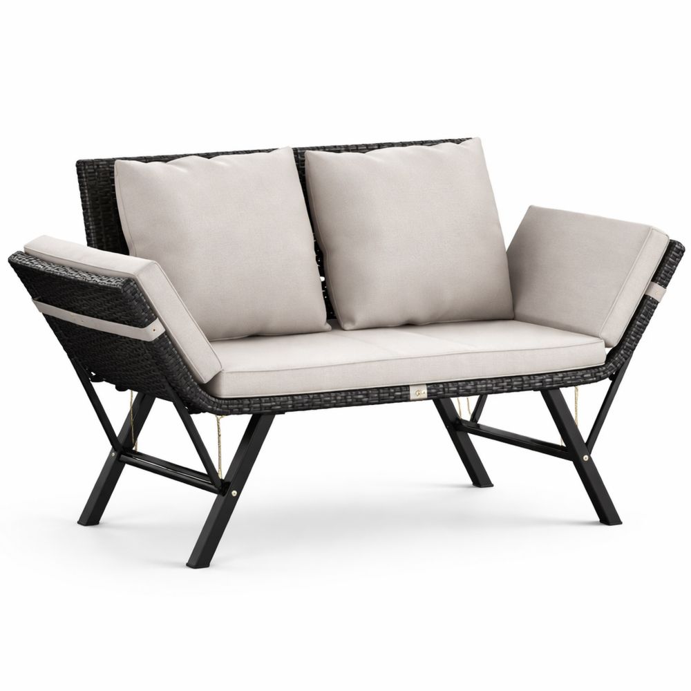 Multifunktionsbank für den Garten: Die Gartenbank lässt sich in eine Liege umwandeln. Geeignet für Garten, Terrasse oder Balkon. Verstellbare Armlehnen: Die Seiten können mühelos heruntergeklappt werden. Die Bank kann in eine 176 cm lange Liege umgewandelt werden. Komfort: Die 7 cm dicken Auflagen bieten eine Sitzhöhe von 47 cm. Die Rückenkissen messen 50x45x16 cm. Zwei flexible Befestigungsbänder sorgen für stabilen Halt. Belastbarkeit und Wetterbeständigkeit: Das Polyrattan der Bank ist wetterfest und einfach zu reinigen. Das Stahlgestell ist langlebig und robust. Abnehmbare, waschbare Bezüge: Die wasserabweisenden Bezüge sind mit Reißverschlüssen versehen und waschbar bei 30 °C. Für 3 Personen geeignet.